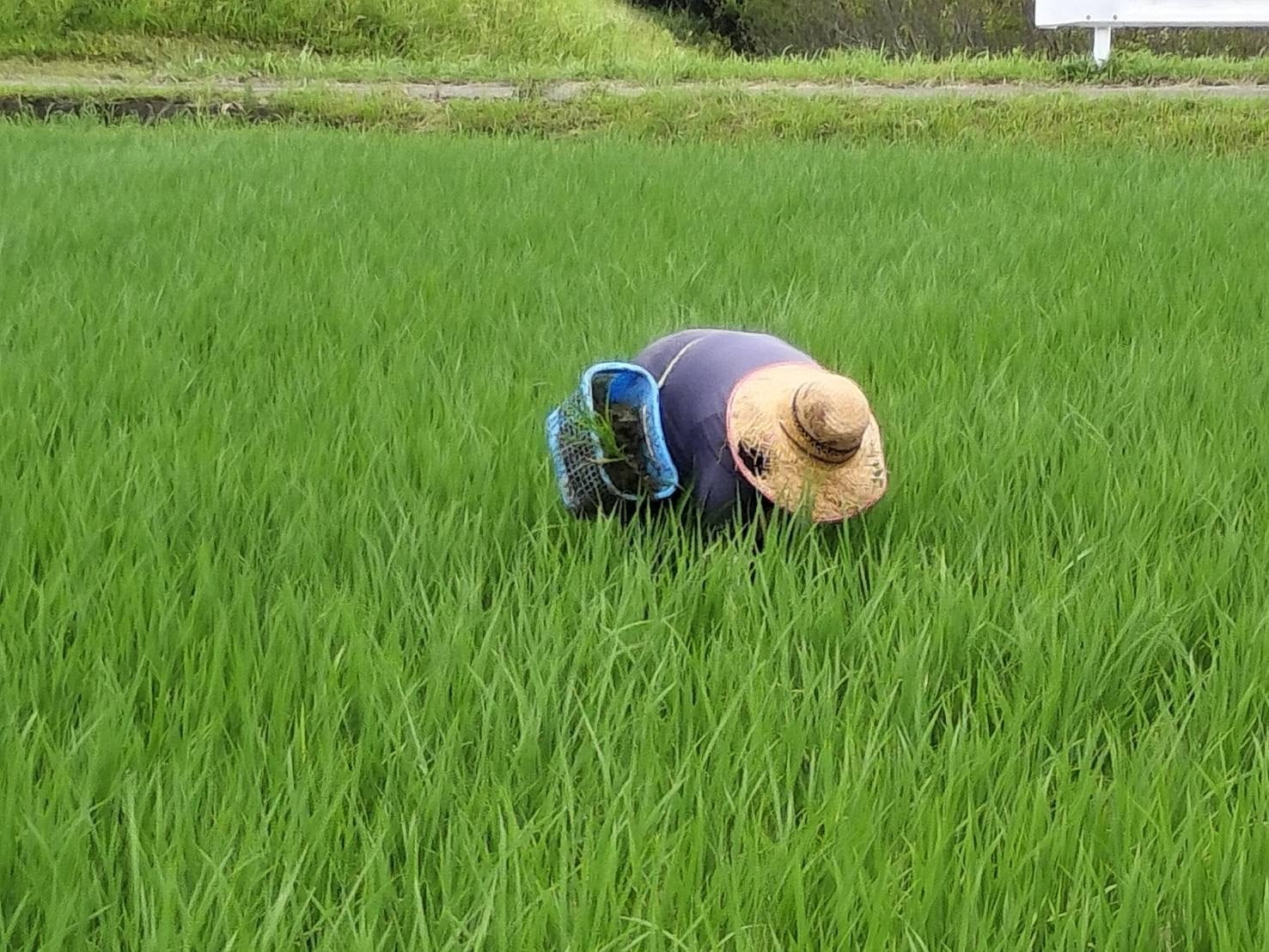穂が実るように、チェーン除草機と手押し除草機で草を抑えつつ、最後は一株ずつ手で草を取り、しっかりと田んぼの中で苗が育つ環境を作っています。