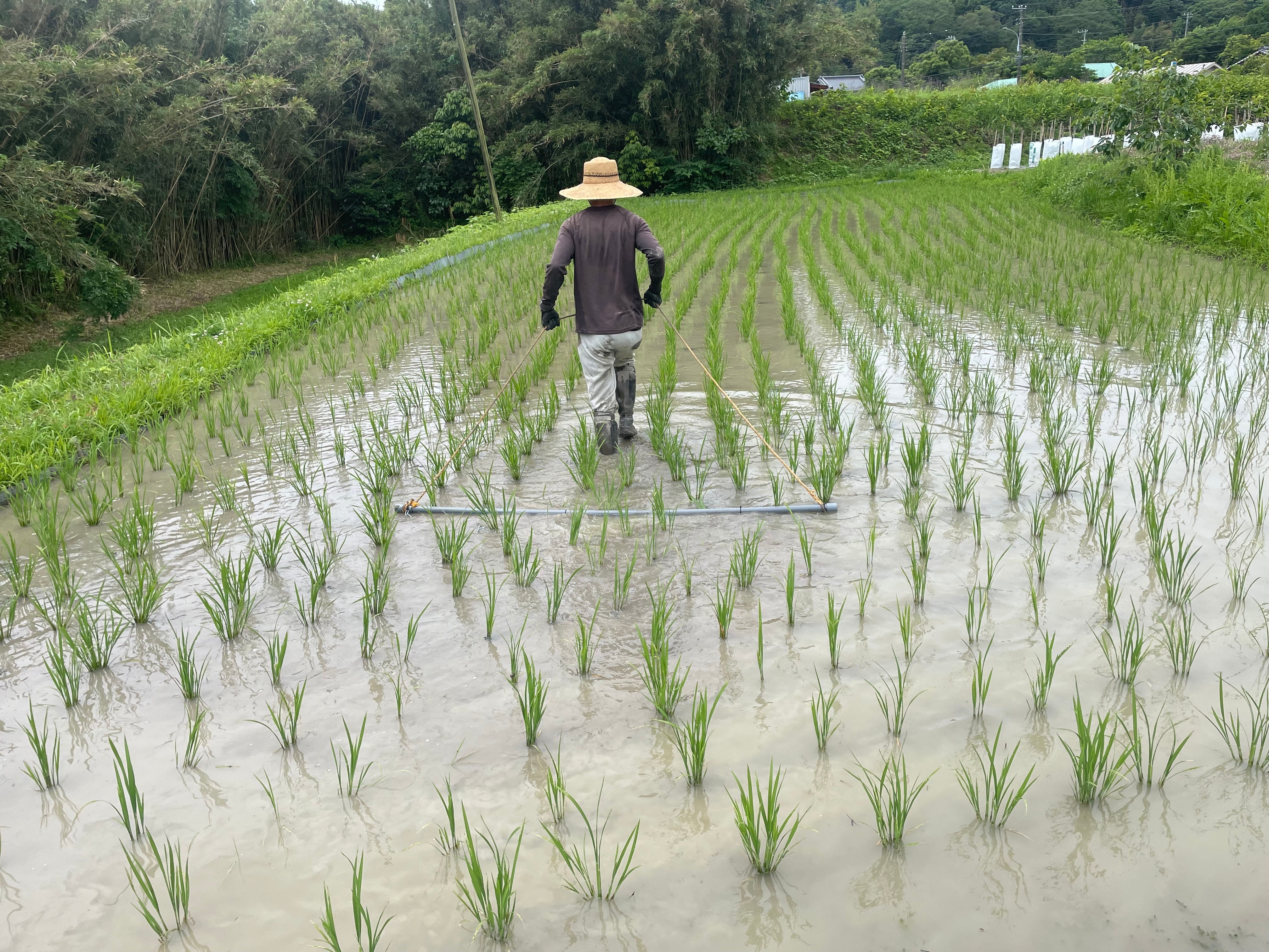 穂が実るようにチェーン除草機と手押し除草機で草を抑えつつ、最後は一株ずつ手で草を取り、しっかりと田んぼの中で苗が育つ環境を作っています。